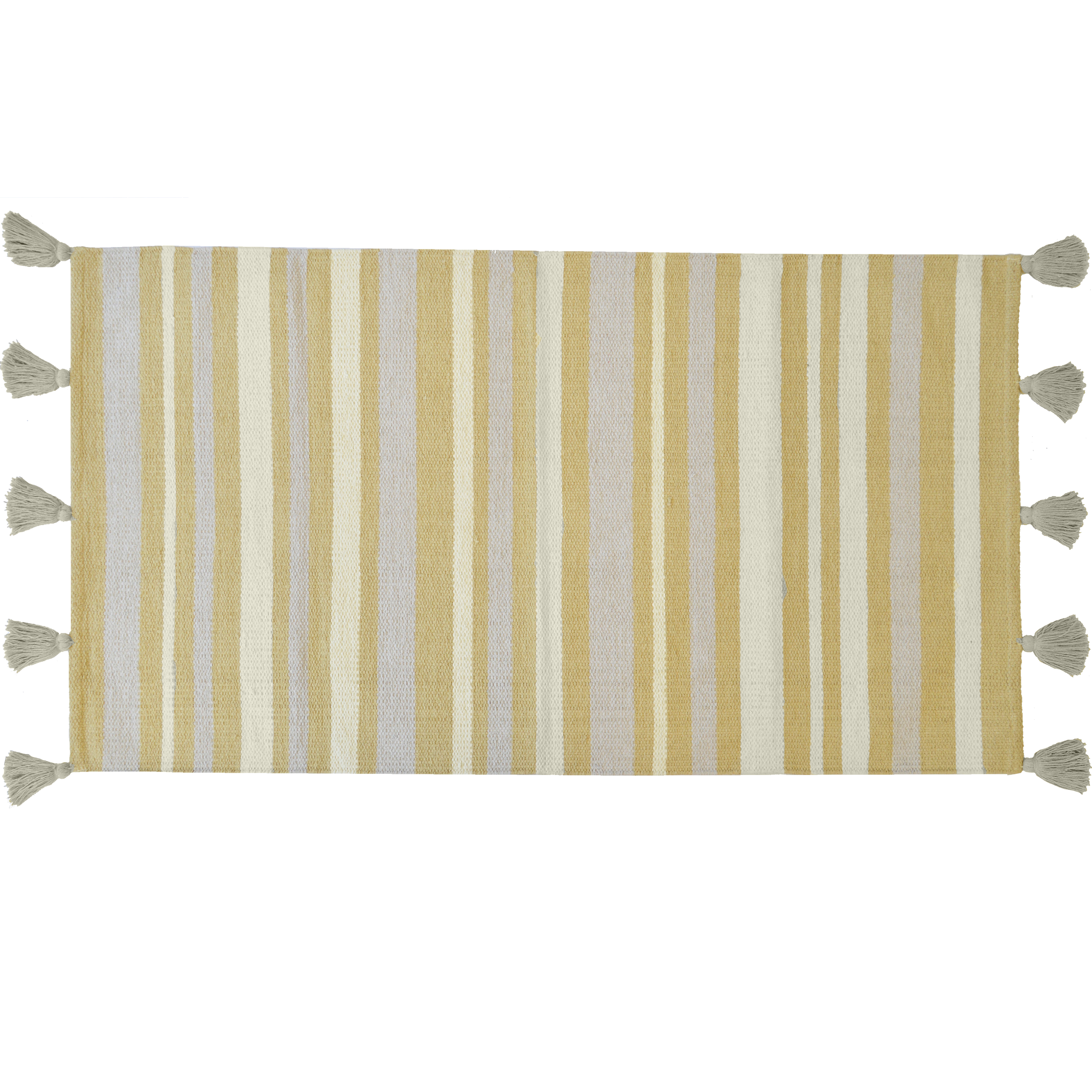 Tappeto di piccole dimensioni, in cotone, con motivo a righe, tessuto a mano. Ideale come scendiletto, all'ingresso e in piccole zone di passaggio. Il tappeto a tessitura piatta è compatto e sottile