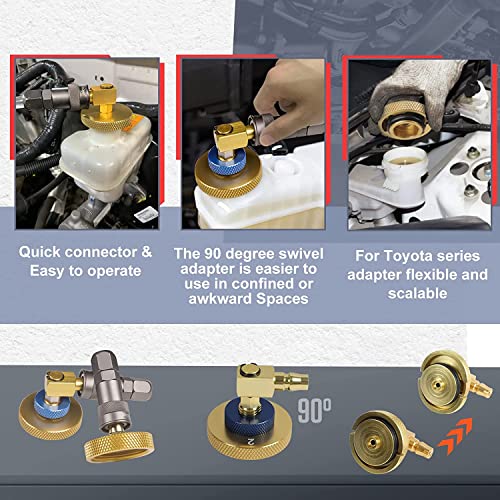 [Attrezzatura di spurgo freni di alta gamma] Il kit di adattatori per lo spurgo del liquido dei freni comprende 17 pezzi di adattatori per cilindro maestro e 1 pezzo di accoppiatore rapido.Ogni adattatore ha una dimensione corrispondente all'auto. L'accoppiamento del tubo maschio standard a 90 gradi si adatta alla maggior parte degli spurghi dei freni. Il connettore rapido da 11 mm sulla parte superiore può essere accompagnato da scarichi del liquido dei freni e scambiatori di liquido dei freni.