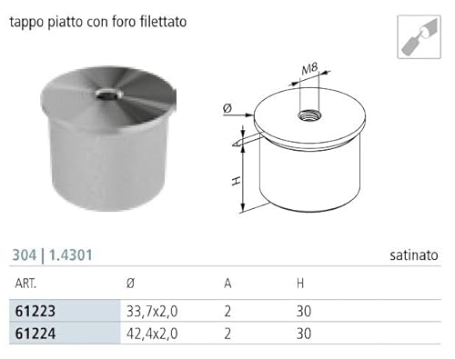 TAPPO TERMINALE IN ACCIAIO INOX AISI 304 PIANO CON FORO FILETTATO M8 - PER TUBO DA Ø42.4MM