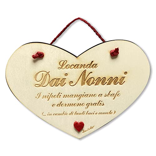 Targa a forma di cuore in legno compensato di pioppo "Locanda dai nonni. I nipoti mangiano a sbafo e dormono gratis (...in cambio di tanti baci e coccole)"