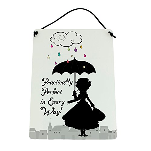 Targa in metallo di Mary Poppins con scritta in lingua inglese "Practically Perfect In Every Way" (Praticamente Perfetta sotto ogni punto di vista)