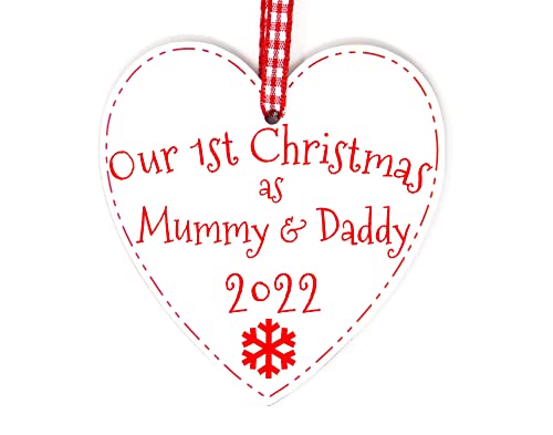 Targhetta a forma di cuore con scritta in inglese "Our First Christmas As Mummy & Daddy", realizzata a mano nel Regno Unito, idea regalo per la mamma e il papà