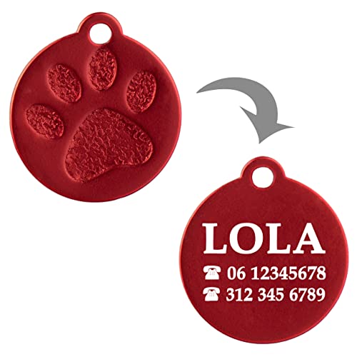 BADGE PERSONALIZZATE: Questo è un badge cane o gatto inciso con le informazioni del tuo animale domestico, essendo un accessorio importante e necessario per la sicurezza del tuo animale domestico e un facile ritorno a casa in caso di smarrimento. Queste targhette identificative hanno una forma rotonda e possono essere personalizzate con le informazioni desiderate. Include una rondella grande e una piccola in modo da poterla appendere al collare del tuo animale domestico. Colore rosa.
