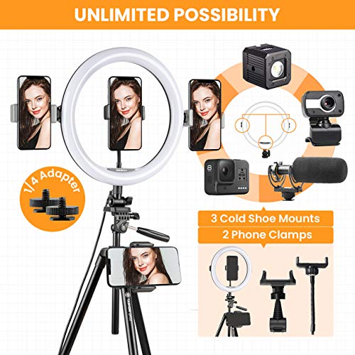 【COMBINAZIONI ILLIMITATE】 Questa luce ad anello di bellezza con supporto per treppiede offre molte più possibilità potenziali con 3 supporti per scarpe fredde incorporati, che rendono possibile il collegamento con dispositivi multipli, incluso telefono (consente fino a 4 telefoni contemporaneamente), microfono, dimensioni ridotte monitor, webcam e altro. Anche il treppiede può essere utilizzato come treppiede separatamente con altre apparecchiature.