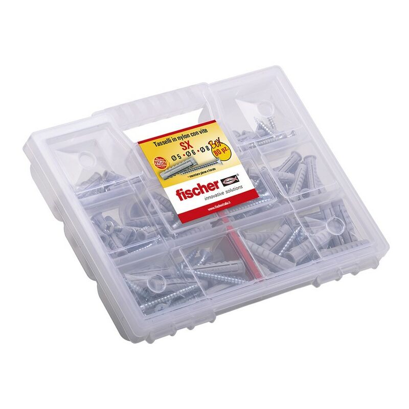 Contenuto 25 pz. SX 5 S + 40 pz. SX 6 S + 15 pz. SX 8 S Kit 80 tasselli Fischer Assortimenti dei fissaggi più utilizzati in una pratica scatola trasparente che assicura il miglior rapporto prezzo / prestazioni. Il fischer Kit in plastica di alta qualità