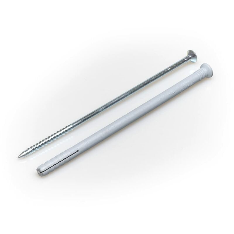 Utilizzabile in materiali da costruzione ad alta resistenza. In acciaio zincato. Vite a croce (testa svasata). Tasselli a testa cilindrica in nylon.