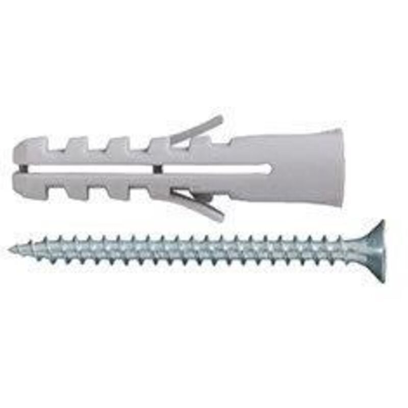 Tasselli In Nylon Ad Espansione, Con Speciali Alette Che Impediscono La Rotazione Nel Foro In Fase Di Serraggio. Idonei Su Calcestruzzo, Mattone Pieno, Pietra Naturale Compatta. Forniti Con Viti Testa Piana Svasata Zincate Bianche.