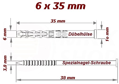 Contenuto della confezione: Ø 6 mm, lunghezza 35 mm, contenuto 200 pezzi, tasselli in nylon con vite a percussione (premontata)