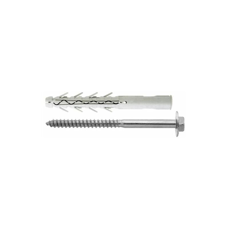 Completo di vite zincata bianca TER con rondella integrata da Ø 34 mm. Tipo prolungato con bordo, adatto per fissaggi pesanti. Utilizzabile su calcestruzzo, mattone pieno e semipieno, mattone forato, blocco 'Poroton', cemento cellulare, pietra compatta.