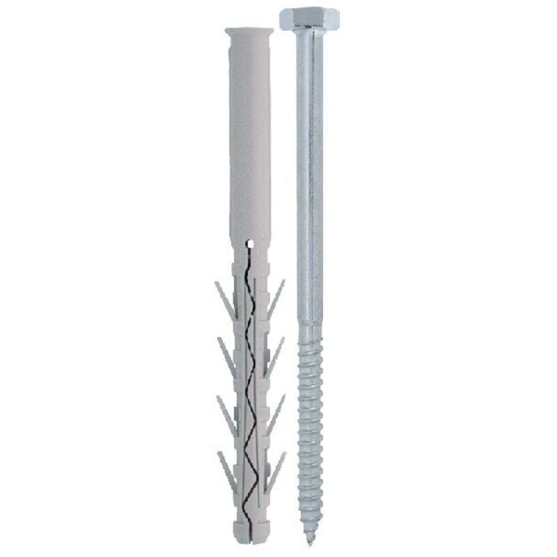 In nylon, con bordo ed alette antirotazione, vite a testa esagonale in acciaio zincato bianco, tipo prolungato, per fissaggi pesanti, confezione da 100 pezzi.