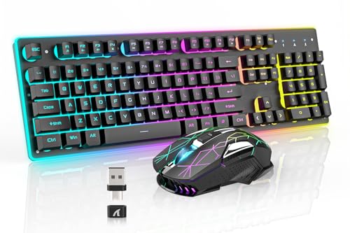 【Tasti retroilluminati RGB e illuminati con caratteri】il design luminoso di lettere, logo, spazi vuoti e dintorni la rende la migliore tastiera wireless illuminata sul mercato. Il mouse ha un effetto di illuminazione graduale ciclico a 7 colori. La tastiera ha 12 modalità di retroilluminazione per illuminare la scrivania.
