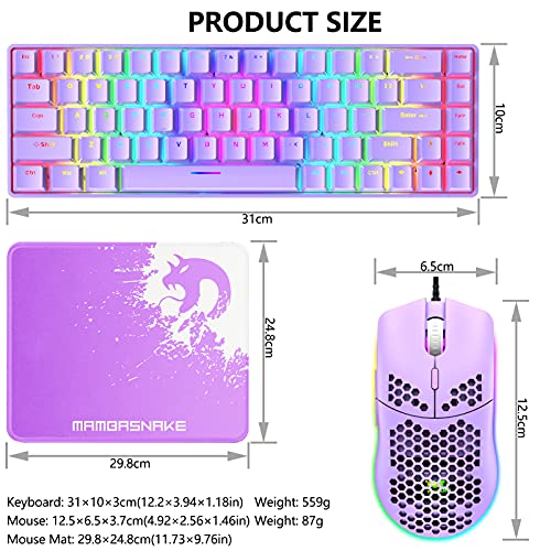 Tastiera e Mouse RGB Gaming Cablate, 68 Tasti Switch Blu 60% Mini Tastiera Meccanica, Topo Programmabile Leggero Favo da 6400 DPI, Cavo da USB a Tipo C, Compatibile con Windows Mac PC PS4 XBox, Viola