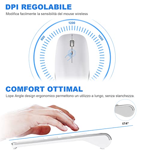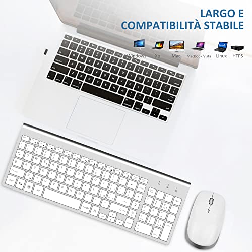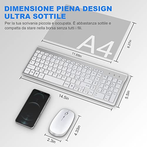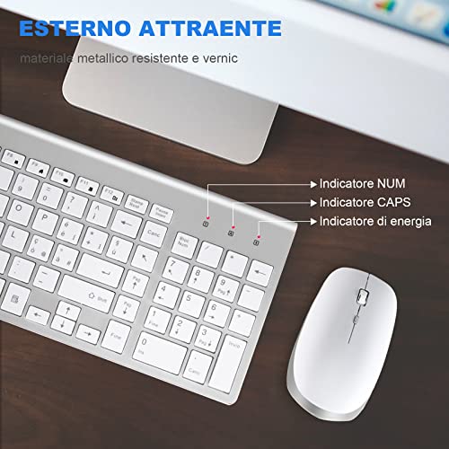 Tastiera e Mouse Wireless, Compatto Ergonomia Sussurro Silenzioso Kit Mouse Tastiera Set Layout Italiano QWERTY Ultra Sottile Dimensione Piena con Tastierino Numerico per PC Laptop Tablet, Argento