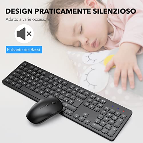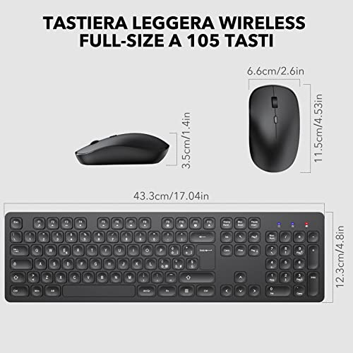 Tastiera Mouse Wireless, WisFox 2,4 GHz Set Tastiera e Mouse con 12 Tasti Multimediali, 800/1000/1200DPI Silenzioso Mouse, Full Size Slim Tastiera per PC, Desktop, Mac, Computer, Windows XP/7/8/10