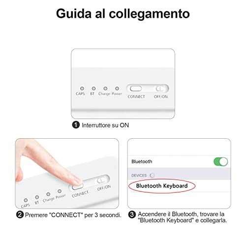 【Connessione wireless e ricarica】La connessione wireless con i tuoi dispositivi mobili come tablet e telefoni cellulari, offre maggiore praticità quando è necessario digitare, distanza operativa fino a 10 m/33 piedi. Tramite il cavo di ricarica USB incluso, 30 giorni di uso continuo o 120 giorni in modalità standby dopo una ricarica completa.