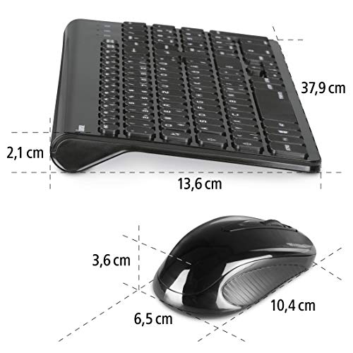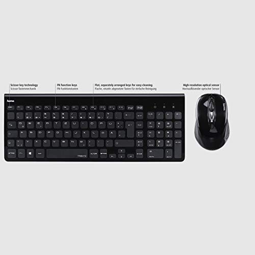 Hama Tastiera wireless con set di mouse wireless (tastiera silenziosa per computer con tasti piatti, tastierino numerico, layout QWERTZ tedesco, mouse ottico wireless, 1200 dpi, portata 8 m) nero