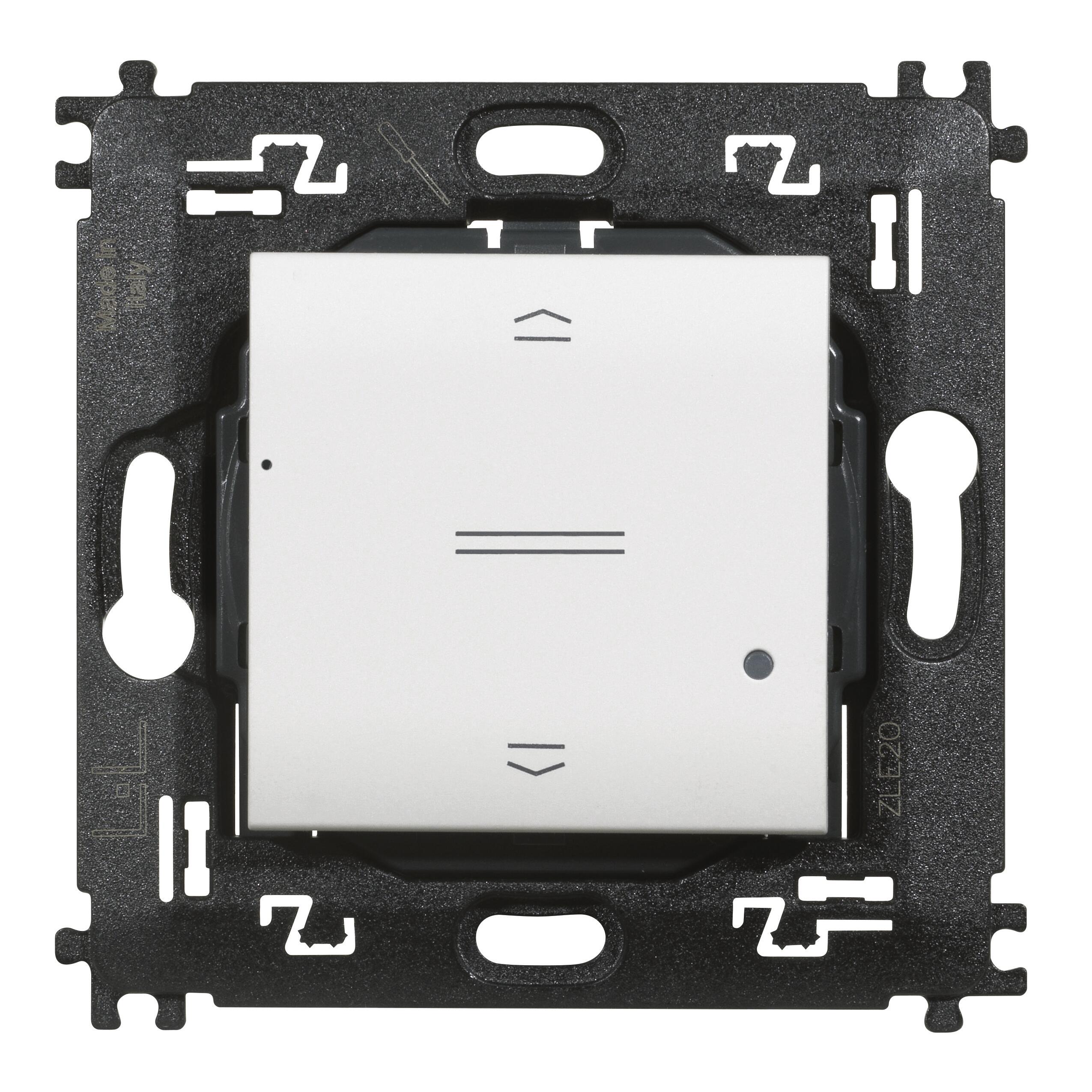 Comando tapparelle wireless. . Alimentazione a batteria 3 V tipo CR2032 (fornita a corredo) con autonomia di 8 anni - 2 moduli. Installare un comando tapparelle supplementare senza cablare. Permette il controllo di uno o più comandi tapparella connessi. Installazione superficiale con adesivi riposizionabili (forniti a corredo) o su scatole da incasso. LED integrato per la segnalazione di batteria scarica. Compatibilità con serie Livinglight