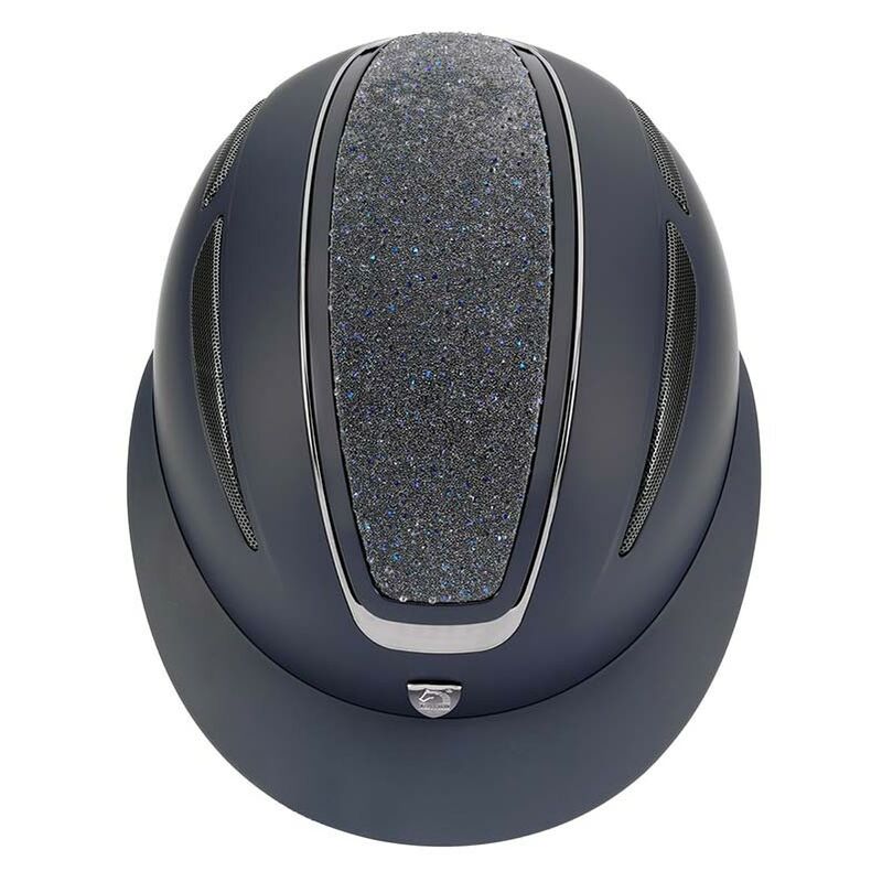 Cap da equitazione Tattini modello “Cassiopea” a visiera larga con placca superiore centrale cangiante decorata con glitter e cristalli e profilatura lucida in acciaio. La calotta realizzata in polistirene, con imbottitura rimovibile e lavabile, garantisce ottima resistenza e assorbimento di urti, colpi e cadute. La parte superiore del cap è decorata con cristalli per un elegante effetto brillante e profili lucidi in acciaio. Il cap è dotato di doppie griglie di ventilazione laterali per una migliorata circolazione dell'aria. Visiera rinnovata, più larga ed avvolgente sulla testa. Cinturino con regolazione a strappo. Sistema di regolazione con rotella posteriore. Omologazione CE VG1 e Certificazione TÜV. Colori: blu o nero Misure: S (53-55) - M (56-58)