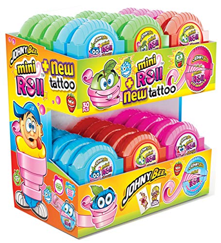 Mini Roll + Tattoo gusto Mela Verde, Fragola, Anguria e Mirtillo. Contenitore Colorato Pratico e Tascabile. Ideale per Feste di Compleanno e Caramellate. Box 30pz