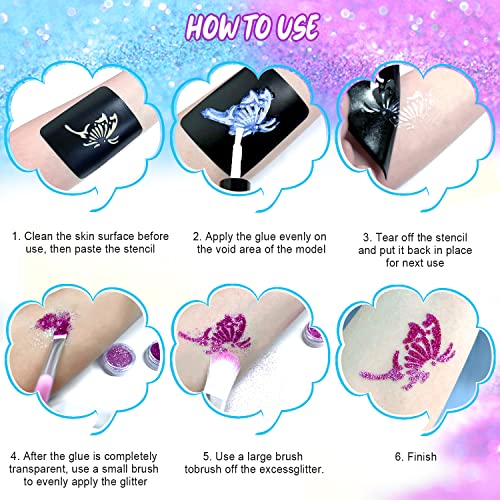 Protezione dell'ambiente, innocuo - il kit per tatuaggi glitterati è composto da ingredienti ed estratti di alta qualità, sicuri e alla moda, e può essere utilizzato su qualsiasi parte del corpo, come viso, braccia, corpo e piedi. Trucco di carnevale con tatuaggi glitterati Non solo per bambini, ma anche per adulti. Tutti gli ingredienti sono delicati sulla pelle e sicuri, tuttavia, consigliamo comunque di testare la pelle sensibile o i bambini di età inferiore a 3 anni prima dell'uso.