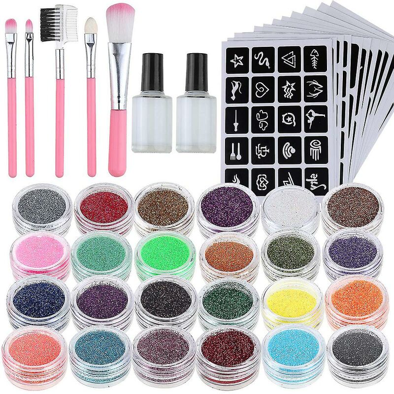 Set di tatuaggi glitterati con 24 scintillii di colore, ognuno dei quali ha 125 stencil per tatuaggi glitterati a tema. Tutto ciò di cui hai bisogno per avere subito una straordinaria body art. Puoi usare il kit del tatuaggio su tutto il corpo, viso, braccio, anche sulla nail art. Le possibilità sono infinite. Per la maggior parte delle età compresi bambini e adulti. Ideale per i festival per creare feste artistiche per bambini Gioco fai-da-te del gioco del prefetto della ragazza, gioco di vestire, recitare ruoli. Divertiti con gli amici. Il kit per tatuaggi è delicato sulla pelle, questo è certo che ci saranno dipinti ad olio per viso e corpo delicati sulla pelle e di alta qualità. Facile da usare, gli stencil sono facili da rimuovere e non danneggiano la pelle. I tatuaggi glitterati sono impermeabili e durano 1 - 2 settimane. Dipende dalle condizioni normali e da una corretta manutenzione. Puoi rimuovere con un sapone o uno struccante.