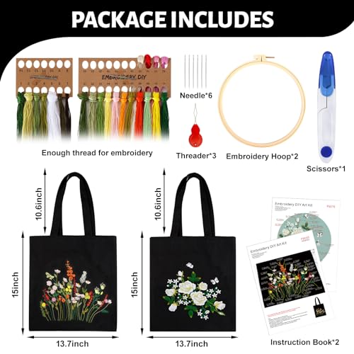 【Bello Set Di Borse Da Ricamo】Il kit da ricamo comprende 2 pezzi di borse in tela stampata,2 pezzi di telai per ricamo,abbastanza filo da ricamo,1 pezzo di forbici,6 pezzi di aghi da ricamo,3 pezzi di infila-ago.Viene fornito con un set completo di accessori per ricamo e istruzioni,questo kit ti consente di goderti il ricamo e completare un pacchetto di ricamo bellissimo e unico.