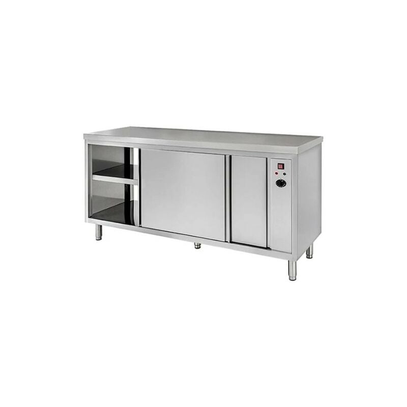 Codice RS4646 - Scaldapiatti armadiato passante, ripiano intermedio forato, antine scorrevoli tamburate su entrambi i lati, modello RP-DSTACPE167, costruito in acciaio inox 430, dimensioni cm. 160x70x85 (lxpxh). Piano con spessore 4 mm in acciaio inox, rinforzato da un sottopiano in legno truciolare idrofugo spessore 18 mm. Riscaldamento con ventilazione e termostato regolabile fino a 90 °C, 230 volt, 2500 watt. Piedini regolabili in altezza.