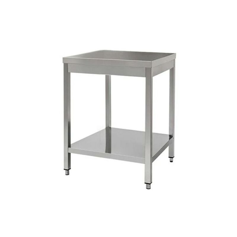 Codice RS3833 - Tavolo da lavoro su gambe e piano di fondo, modello RP-DSTGE057, costruito in acciaio inox 430, dimensioni cm. 50x70x85 (lxpxh). Piano con spessore 4 mm in acciaio inox, rinforzato da un sottopiano in legno truciolare idrofugo spessore 18 mm. Gambe con profilo quadrato 40x40 mm con piedini regolabili in altezza. Fornito in kit smontato.
