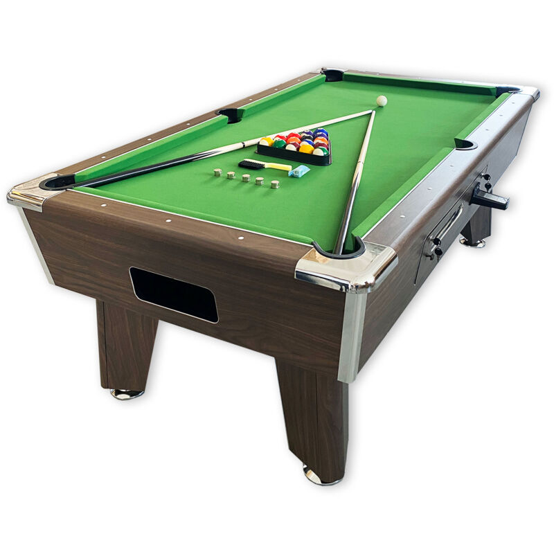 7FT COMPETITION - NUOVO TAVOLO DA BILIARDO CON GETTONIERA MANUALE Il tavolo da biliardo 7FT COMPETITON è uno dei principali tavoli da biliardo in “stile bar” commerciale disponibili oggi. Questo tavolo da biliardo beneficia di un design robusto e di un elegante aspetto “stile pub”, che sarà perfetto per la tua sala giochi o attività commerciale. Questo modello è fornito di gettoniera manuale con 50 gettoni inclusi Con la sua finitura in venatura di legno scuro e panno verde, il tavolo da biliardo COMPETITION è perfetto per chi cerca un tavolo di qualità per il proprio pub, club, attività commerciale o altra area di uso pubblico. Un tavolo di alta qualità che ha anche un'unità di deposito monete sicura, che lo rende ideale per l'uso commerciale. SPECIFICHE TECNICHE: TAVOLO DA BILIARDO Colore: venatura di legno scuro con tappeto verde . Dimensioni tavolo: 213 x 120 x H 81 cm Spessore tavolo: 35 cm Dimensione buche: 10 cm Materiale: MDF spesso, resistente e durevole.< br />Fornito con