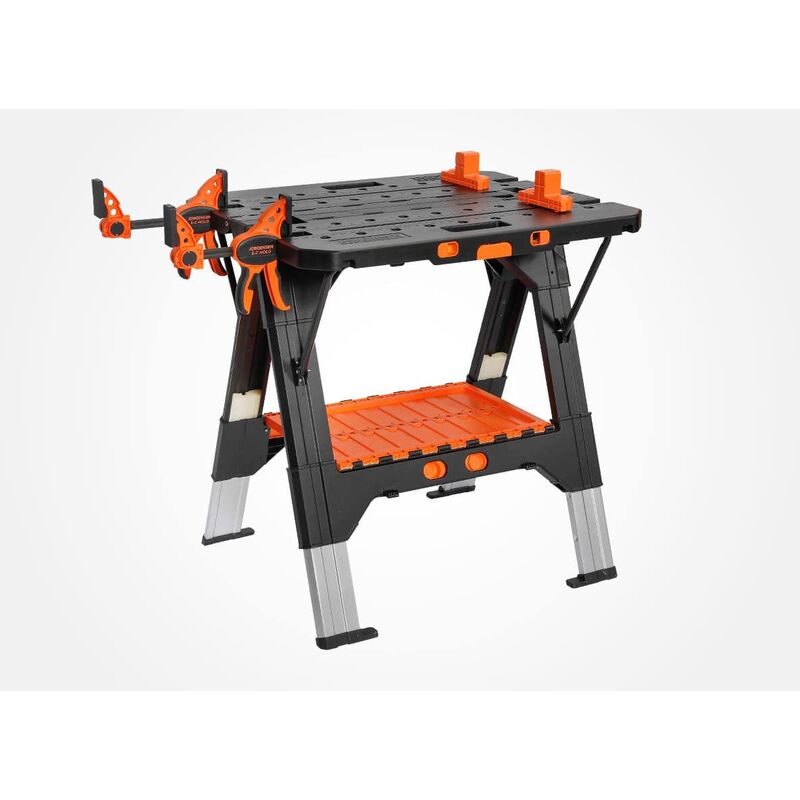 Banco da lavoro 2 in 1 che si trasforma rapidamente in un cavalletto per supportarti in tutti i tuoi progetti. Fornito con 2 morsetti e 4 cunei di bloccaggio per fissare tutti i tipi di parti orizzontalmente / verticalmente . Piedini regolabili in altezza per adattarsi a tutti i terreni e offrire una maggiore versatilità. Leggero, può essere trasportato senza sforzo in cantiere, a pavimento o nel seminterrato. Ripiano integrato per riporre morsetti e cunei o per tenere gli strumenti a portata di mano. Piano del tavolo: 787 x 635 mm Altezza: 635/723/812 mm Capacità di bloccaggio: 750 mm Capacità di carico: Banco da lavoro 225 kg Trespolo 450 kg