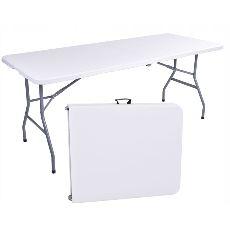 Tavolo ristorazione FETA pieghevole in valigia 180 cm bianco Modello: FETA | Dimensioni: 180 cm | Colore: bianco Tavolo da ristorazione molto pratico e leggero. Struttura in acciaio. Il piano del tavolo è realizzato in plastica resistente. Una volta piegato, il tavolo forma una pratica valigia, quindi occupa poco spazio ed è facile da trasportare. Perfetto per il campeggio. Grazie al design unico, l'intera struttura si nasconde nel piano del tavolo. Molto facile da trasportare. Il materiale resistente e di altissima qualità utilizzato per produrre il piano di lavoro lo rende il più resistente e spesso disponibile sul mercato polacco. Proprietà Costruzione stabile Sistema di apertura e piegatura efficiente e solido. Materiale del piano del tavolo: polietilene HDPE 100% impermeabile Resistente per molte stagioni Materiale del telaio: acciaio verniciato a polvere Maniglie pieghevoli e comode per il trasporto Leggero, occupa poco spazio quando imballato Gambe con staffe di bloccaggio I