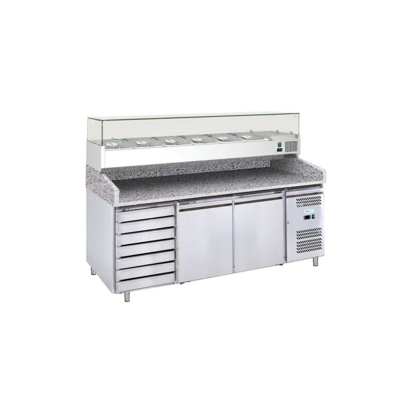 Codice RS9799 - Tavolo frigorifero per pizzeria a 2 porte + cassettiera (non refrigerata) + vetrina refrigerata, modello FO-G-PZ2610TN-FC+G-VRX2000-330, dimensioni cm. 202x80x143.5 (lxpxh), temperatura di esercizio -2/+8 °C, 230 volt, 275 watt, 386 lt, in dotazione n.7 coppie guide per porta. Piano in marmo con alzatine perimetrali. Vetrina capacità n.10 bacinelle GN1/4 (non comprese nella fornitura). Struttura in acciaio inox. Refrigerazione ventilata. Gruppo incorporato estraibile per facile manutenzione. Andamento circolare dell'aria fredda in modo da non toccare direttamente il prodotto. Controllo temperatura elettronico con termostato digitale. Resistenza elettrica intorno alla cornice porta per eliminazione della condensa. Sbrinamento automatico con resistenza elettrica e controllo automatico della temperatura di sbrinamento. Evaporazione automatica dell'acqua di condensa. Evaporatore trattato anticorrosione. Porta con molla di ritorno. Guarnizione porta estraibile senza