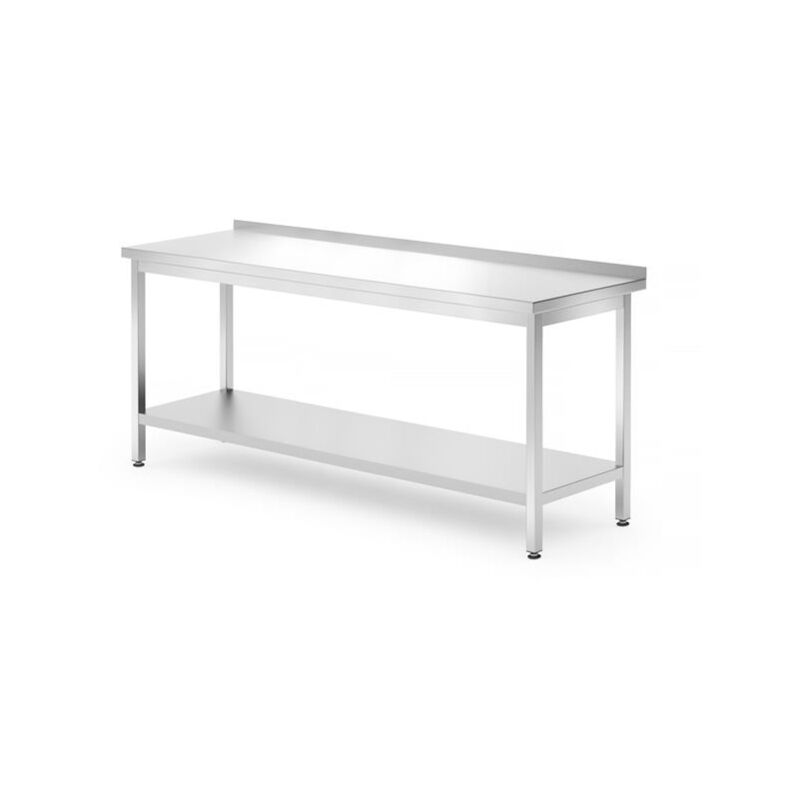 Realizzato in acciaio inossidabile AISI 430. Gambe realizzate con profili da 40 x 40 mm. Gambe regolabili - 25 mm verso l'alto o 5 mm verso il basso. Tavolo professionale con piano di lavoro e ripiano aggiuntivo. laboratori, ecc. Rinforzo delle gambe grazie al ripiano, consente di eseguire lavori pesanti e posizionare piccoli dispositivi sul piano del tavolo, ideale per le aziende di ristorazione e se è necessario riporre temporaneamente il tavolo senza riempirlo altezza di 200 mm, non regolabile. Il carico consentito approssimativo del piano del tavolo e del ripiano è di 70 kg/m2
