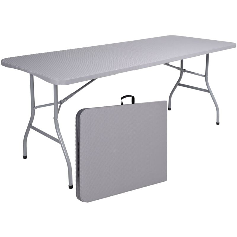 Tavolo ristorazione RATTAN, pieghevole a valigia, 180 cm, grigio Modello: RATTAN | Dimensioni: 180 cm | Colore: grigio Piano di lavoro che imita il rattan. Molto pratico e leggero. La struttura è realizzata in acciaio verniciato a polvere. Piano del tavolo realizzato in polietilene HDPE. Modellato sul rattan. Resistente alla luce solare. Grazie al design unico, l'intera struttura si nasconde nel piano del tavolo, occupando poco spazio e creando una valigia ergonomica e facile da trasportare. Le sue dimensioni permettono di ospitare fino a 12 persone. Il tavolo pieghevole in rattan è un tavolo dall'uso universale. Servirà con successo come tavolo da catering, commerciale o da giardino. Grazie al piano adeguatamente spesso funzionerà in tutte le condizioni. Caratteristiche Struttura in metallo verniciato a polvere Piano del tavolo realizzato in resistente materiale HDPE Comoda maniglia per il trasporto Si piega in una valigia Gambe antiscivolo Blocca prima di piegare le gambe Blocca