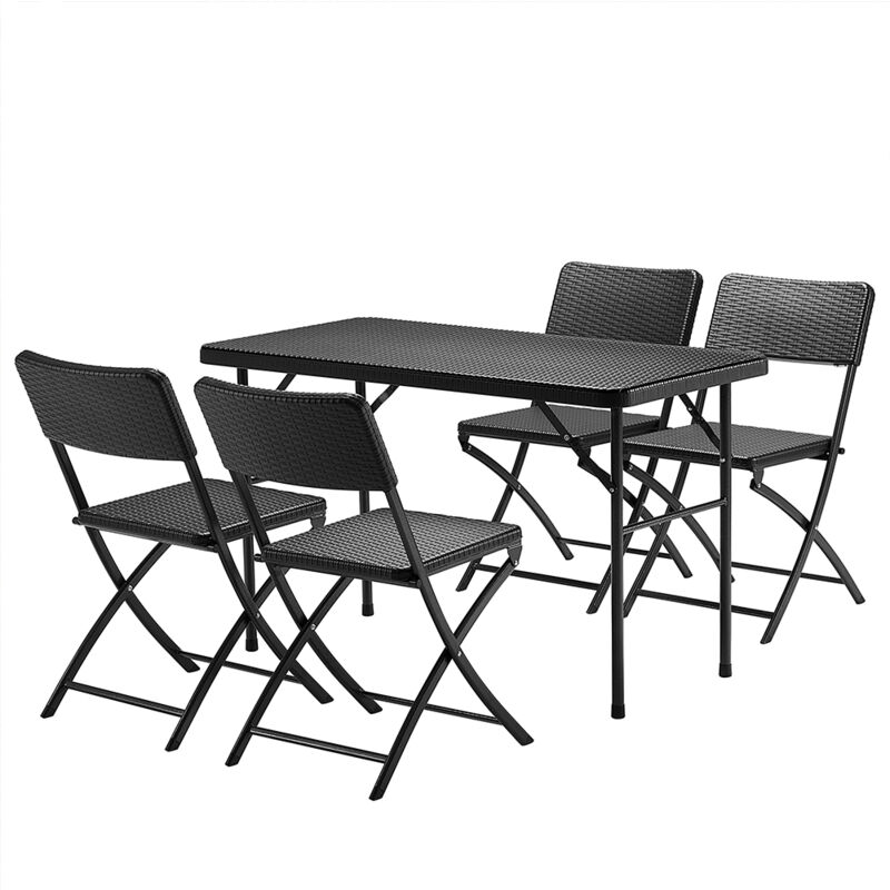 Dona un tocco elegante e raffinato agli ambienti esterni di casa tua con questo fantastico set da giardino con sedie e tavolo. Questo fantastico set da giardino è realizzato interamente in polyrattan materiale molto resistente e di altissima qualità perfetto per gli ambienti esterni. Il set è composto da 4 sedie e da un tavolo di 122 x 60 x 74 cm, le solide strutture in tubolari di acciaio inox di ogni componente è completamente pieghevole e salvaspazio, ciò consente di poter conservare il set anche negli ambienti più piccoli quando non utilizzato. Dal design semplice e moderno questo set da giardino renderà i vostri spazi esterni davvero unici. SPECIFICHE PRODOTTO: Dimensioni tavolo: 122 x 60 x 74 cm Materiale: Acciaio Inox e Polyrattan Colore: Nero Necessita di Montaggio: No Strutture pieghevoli e salvaspazio Il set è composto da 4 sedie e un tavolo Design semplice e moderno CONTENUTO DELLA CONFEZIONE: 1 x Set Tavolo + 4 Sedie Pieghevole Arredo Esterno Giardino in Polyrattan Nero