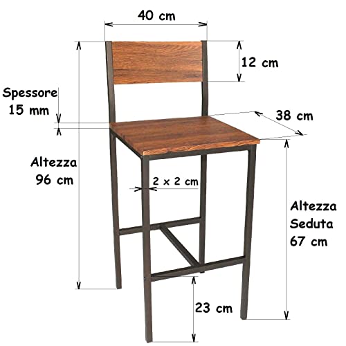 DIMENSIONI SGABELLI: Larghezza 40 cm - Profondità 48 cm - Altezza 96 cm - Altezza seduta 67 cm - Sedile larghezza 40 cm x profondità 38 cm - Spalliera larghezza 36 cm x altezza 12 cm - Peso 4 kg
