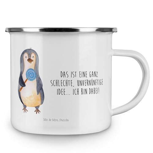 Tazza con motivo con pinguino con lecca lecca, Metallo a effetto smaltato, bianco