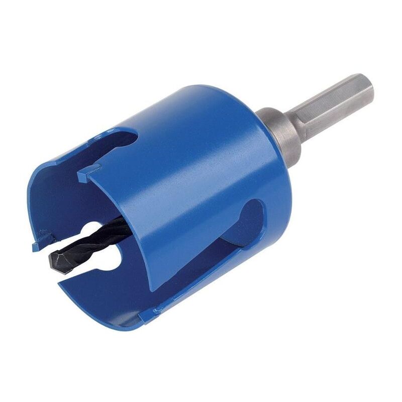qualità omologata TÜV Descrizione del prodotto Questa versatile sega a tazza universale con mandrino è idonea per l'uso sui materiali più svariati. Le lame speciali in metallo duro consentono di realizzare con estrema facilità fori su murature dolci e di durezza intermedia in pietra, legno (dolce e duro), plastica, pannelli isolanti e per costruzioni a secco. Grazie alla profondità di taglio di 60 mm e