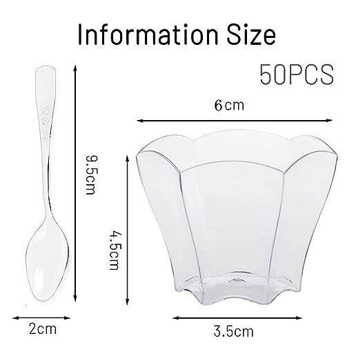 1. 【Tazze da Dessert in Plastica】50 tazze da dessert trasparente con 50 cucchiai. Apertura della tazza: 5 * 5 cm, Altezza della tazza: 4.5 cm, Fondo della tazza: 3.5 * 3.5 cm.