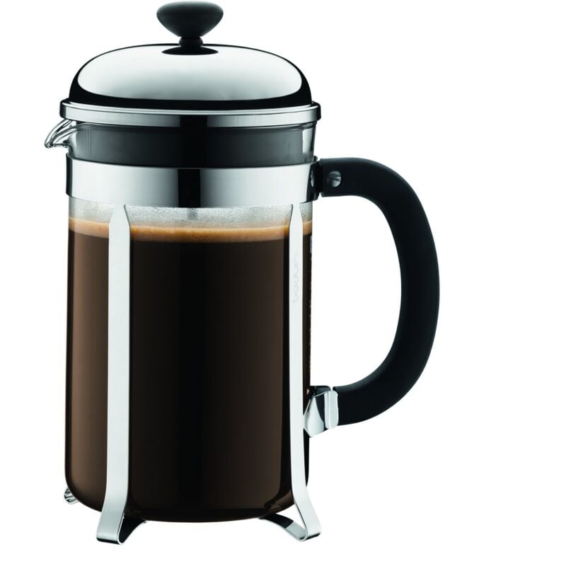 Chambord Bodum 11735-16 French press 12 tazze con manico in santropene. Questa stampa francese è un must! Il design di questa iconica caffettiera del marchio BODUM è stato creato negli anni '50! Semplice, veloce ed economico per un caffè dal gusto impareggiabile! Caffè, un po 'di acqua calda e il tuo caffè è pronto da gustare! La stampa francese può essere utilizzata ovunque e senza elettricità. Puoi preparare fino a 12 tazze contemporaneamente. Pistone al centro, all'estremità del quale è provvisto di un disco forato che assume il ruolo di filtro. Dopo aver posizionato il caffè macinato sul fondo della caffettiera, versare l'acqua bollente e lasciare riposare da 2 a 5 minuti a seconda della forza desiderata, quindi abbassare lentamente lo stantuffo: la piastra del filtro tratterrà i fondi sul fondo della caffettiera e far passare il caffè sopra il filtro. Nessun filtro in carta tratterrà gli aromi o gli oli essenziali del caffè! Barattolo da 1,5 L in vetro borosilicato ultraleggero e
