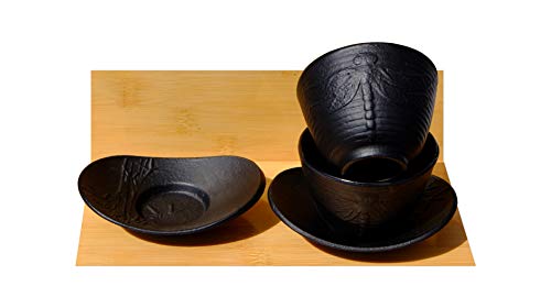 Set D - Set di 2 tazze da tè e sottobicchieri in ghisa, motivo: libellula nera