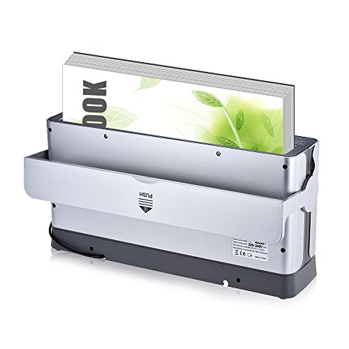 Macchina termica portatile per rilegatura, rilega facilmente in casa. Caratteristiche importanti tradotte in 14 lingue e vengono scritte sul retro della confezione.