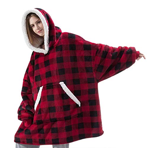 Tbrand - Coperta oversize con cappuccio positivo e negativo, può indossare coperta di agnello, super morbida, calda e confortevole, taglia Griglia rossa e nera. Etichettalia unica