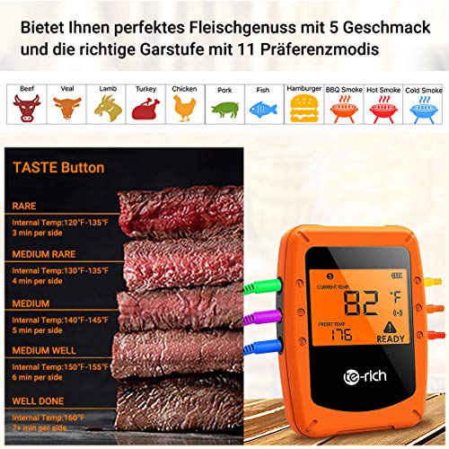 Te-Rich - Termometro da cucina wireless intelligente, con display LCD e magnetico, 6 sonde, supporta IOS, Android