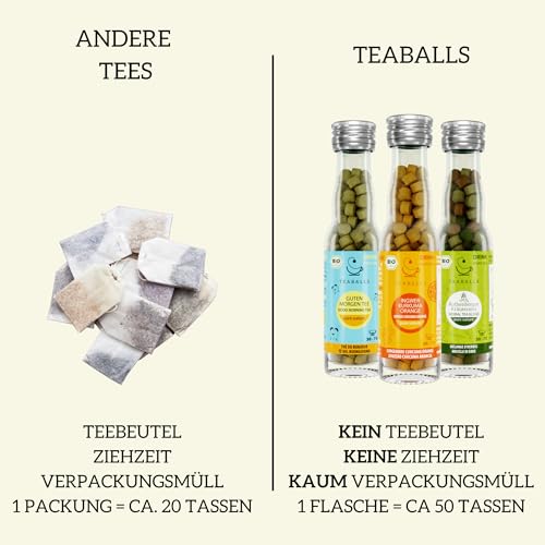 Facile da porzionare - a piacimento aggiungere 2 - 5 Teaballs (a 200 ml) in acqua bollente - mescolare - fatto! Una bottiglia è sufficiente per circa 30-75 tazze di tè. Il fondo naturale torbido è potabile