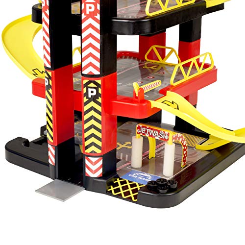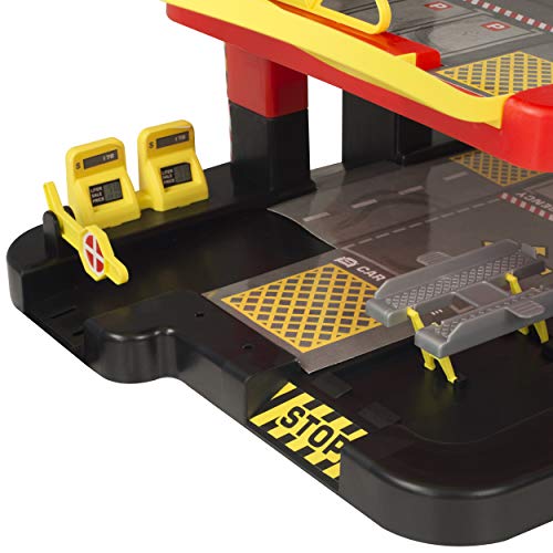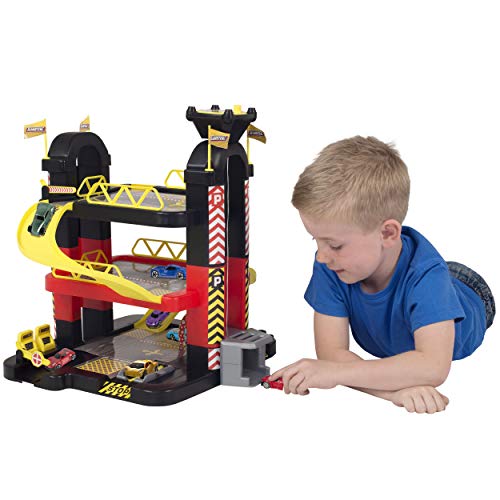 Il set da gioco per garage a 3 livelli dispone di un eliporto, pompe del carburante, barriere, parcheggi e ascensore per auto funzionante con un lanciatore di punte per inviare ogni auto attraverso il livello e giù per la rampa di collegamento.