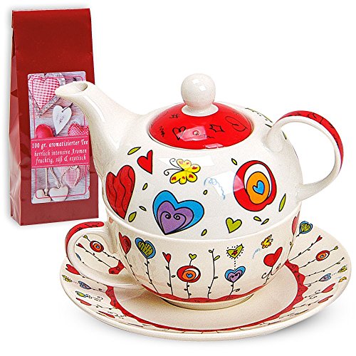 Tea For One Teapot Set With Cup And Saucer In Gift Box 17 x 13 cm Flowers/Hearts Design Red