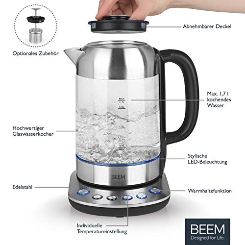 BEEM TEATIME II Bollitore con regolazione della temperatura - 1,7 L | Acciaio inossidabile e vetro | Macchina da tè | Illuminazione LED | Filtro per tè opzionale