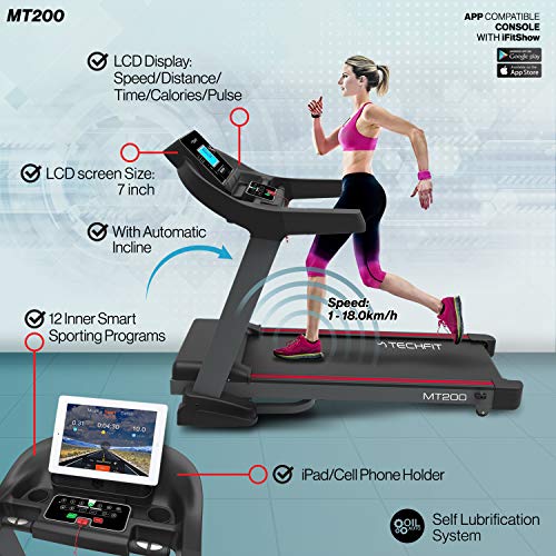 TechFit MT200 Tapis Roulant Motorizzato Elettrico, Sistema di Piegatura Idraulica, 5.0 HP, Superficie di Corsa 1300x480mm, Supporto per Tablet, Bluetooth, Lettore MP3, USB