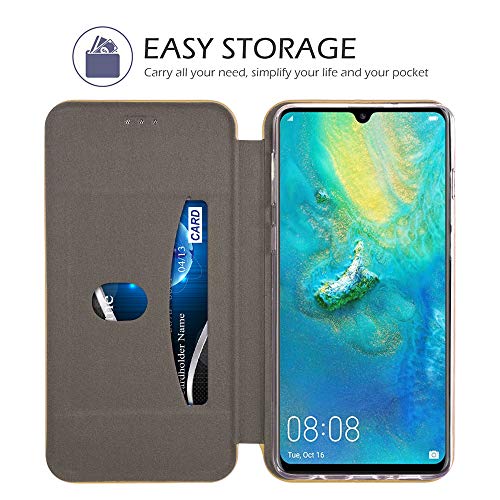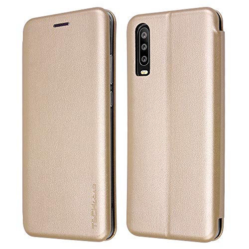 TECHGEAR Custodia Compatibile con Huawei P30, Cover Sottile Morbido e Protettivo in PU Pelle con Chiusura Magnetica, Slot per Schede e Supporto per Huawei P30 - Oro